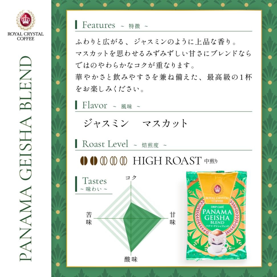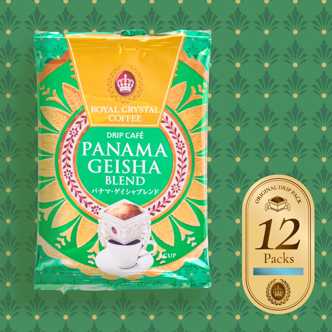 【オンラインストア限定】 パナマゲイシャブレンド <デイリーコーヒー/箱なし/12袋> 毎日の暮らしに寄り添う、ご自宅用デイリーコーヒーセットが新登場。 ロイヤルクリスタルのブレンドの魅力を、ご家庭でも手軽にお楽しみいただけるドリップコーヒーセットです。 朝の一杯から仕事の合間、食後のリラックスタイムまで。 極上のブレンドコーヒーを日常的に楽しんでいただけるよう、オンラインストア限定でセット販売を開始しました。 「まずは一度、飲んでみたい」という方にもおすすめ。 お湯を注ぐだけで、ハンドドリップのような安定した美味しさと香りをお楽しみいただけます。 ストックしやすく、ご自宅でのデイリーコーヒーに最適なセットです。